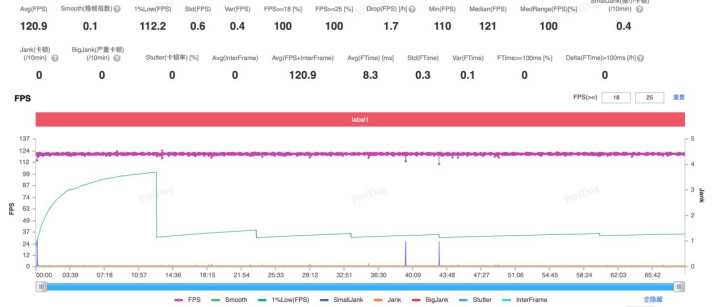 简单测试一下游戏,在室温25度环境下,将手机屏幕屏幕亮度调至200nit,持续1小时的《王者荣耀》排位赛(极致画质+120帧)平均帧率能来到120.9帧,功耗也仅有3.09W,可以说长时间游戏也能持久满帧。